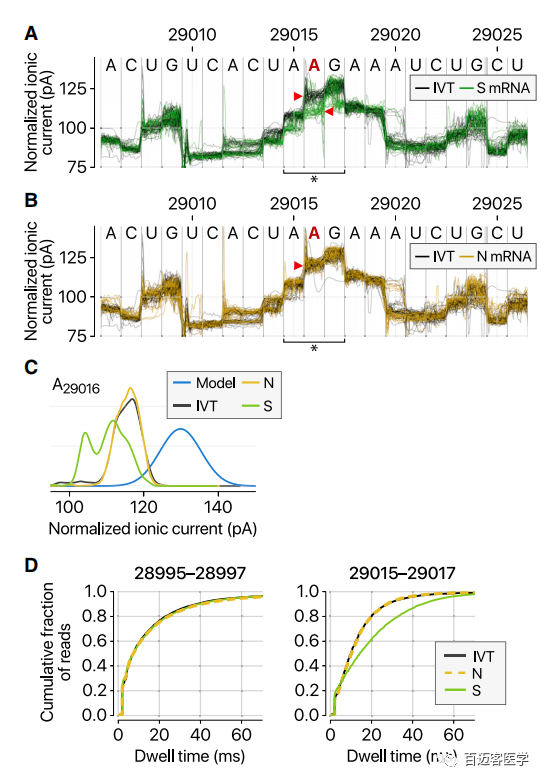 研究人員用DRS數(shù)據(jù)檢測(cè)了SARS-CoV-2的表觀轉(zhuǎn)錄組學(xué)。病毒RNA修飾在40多年前就已描述過(guò)(Gokhale and Horner,2017)。為了明確研究RNA修飾,作者通過(guò)體外轉(zhuǎn)錄病毒序列生成了陰性對(duì)照RNA,并對(duì)陰性對(duì)照進(jìn)行了直接RNA測(cè)序。注意到陰性對(duì)照和病毒轉(zhuǎn)錄本之間的離子電流之間的差異非常有趣(圖6A)。至少有41個(gè)位點(diǎn)顯示出實(shí)質(zhì)性差異(頻率超過(guò)20%),表明存在潛在的RNA修飾位點(diǎn)。值得注意的是,某些位點(diǎn)顯示的頻率取決于sgRNA的種類。圖6A–6C,S RNA上比N RNA修飾的位點(diǎn)更多,與S RNA相比ORF8 RNA上的修飾頻率更高。此外,修飾的堿基(圖6D,右)的停留時(shí)間比未修飾的堿基(圖6D,左)的停留時(shí)間長(zhǎng),表明修飾會(huì)干擾RNA分子過(guò)孔速度。