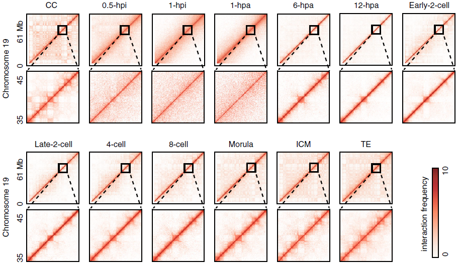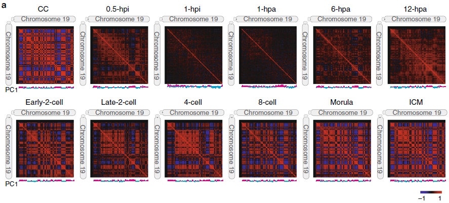 不同時期的胚胎的染色質(zhì)三維構(gòu)象見下圖,圖中分別展示了分辨率為100kb和40kb時的Hi-C互作矩陣。將CC(Cumulus cell)核注入無核卵母細胞后,染色質(zhì)結(jié)構(gòu)TADs和Compartments迅速溶解,并在6-hpa胚胎中部分恢復(fù)。令人驚訝的是,1-hpi和1-hpa單細胞胚胎遠端相互作用明顯較少,并顯示出一致的相互作用模式,這與中期染色質(zhì)組織狀態(tài)高度相似。