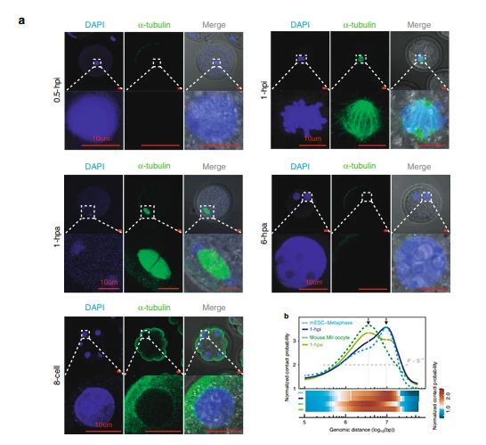 免疫熒光染色在1-hpi和1-hpa胚胎中檢測到紡絲裝置凝聚的染色體,這與其他階段胚胎中帶有核膜的間期染色質(zhì)形態(tài)不同(圖2a)。進一步分析表明,1-hpi胚胎的P(s)曲線與小鼠ESC中期相似,在10Mb時迅速下降,而1-hpa胚胎的P(s)曲線與小鼠MII卵母細胞相似,在4Mb時突然下降(圖2b)。這表明當(dāng)供體細胞在去核卵母細胞中被人工激活1個小時(1-hpa)后,基因組經(jīng)歷了從類有絲分裂中期向類第二次減數(shù)分裂中期的轉(zhuǎn)變。