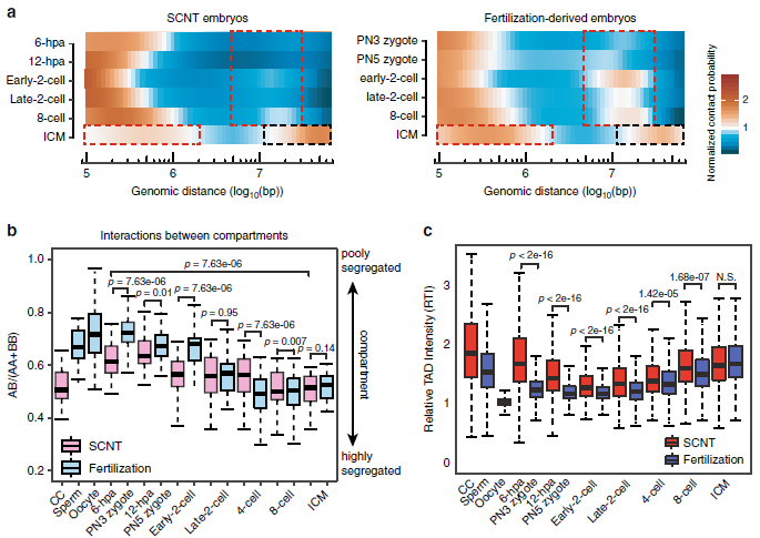 2020年4月14日,同濟大學(xué)生命科學(xué)與技術(shù)學(xué)院高紹榮團隊與江賜忠團隊在Nature Communications雜志在線發(fā)表了相關(guān)研究成果。他們采用經(jīng)過優(yōu)化的少量細胞全基因組染色質(zhì)構(gòu)象捕獲技術(shù)(in situ Hi-C),對小鼠SCNT胚胎發(fā)育過程進行連續(xù)采樣,并詳細描繪了SCNT植入前胚胎染色質(zhì)高級結(jié)構(gòu)的動態(tài)變化過程,同時說明體細胞在移植到無核卵母細胞后,成熟的三維染色質(zhì)結(jié)構(gòu)是如何被重新編程為全能狀態(tài)的。