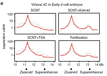 研究表明小鼠SCNT胚胎在合子基因組激活(ZGA)時期有大量的基因未能被正常激活。于是,作者探究了染色質(zhì)空間結(jié)構(gòu)的異常是否會導(dǎo)致增強子與啟動子之間的相互作用無法成功建立。在早2細胞胚胎,發(fā)現(xiàn)關(guān)鍵基因Zscan4d的啟動子與上游的超級增強子的SE-P相互作用在受精卵中很明顯,而在SCNT胚胎中則不存(圖5)。