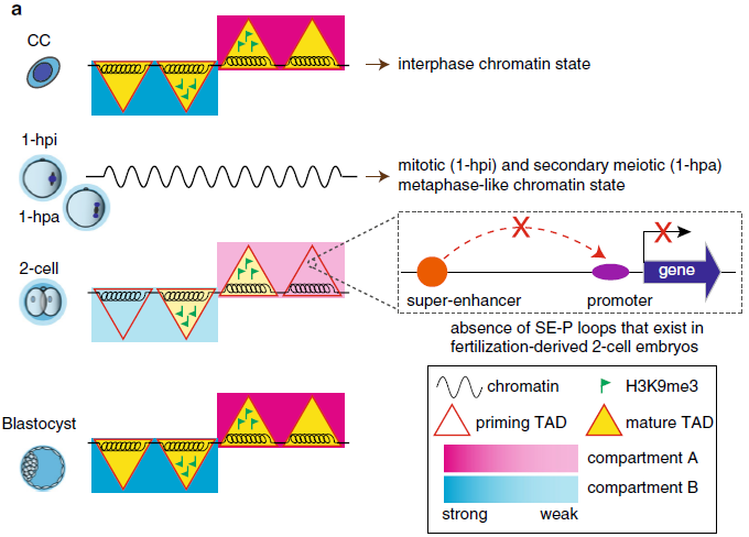 SCNT胚胎發(fā)育6小時(6-hpa)進入擬原核期(對應(yīng)正常受精胚胎PN3時期)后,出現(xiàn)了較弱的TADs(拓撲相關(guān)結(jié)構(gòu)域)信號,并持續(xù)減弱至早期2細胞期,在2細胞晚期到8細胞卵裂期逐步重新建立,直到囊胚期成熟。