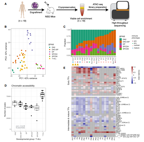 29個(gè)PDX模型中有7個(gè)對(duì)應(yīng)19個(gè)T-ALLs患者中的4個(gè)(圖4A),之前被證明可以再現(xiàn)原發(fā)性白細(xì)胞樣本的染色質(zhì)可及性,與原始患者相比,ATAC文庫富集在TSS區(qū)域。白血病樣品2,823個(gè)細(xì)胞特征OCRs PCA分析顯示與健康T細(xì)胞分離,將其定位在早期DN2和DN3&ISP發(fā)育階段附近(圖4B)。19例白血病患者中16例早期發(fā)育組DN2和DN3&ISP至少占40%(圖4C)。值得注意的是,即使是被免疫表型分類為成熟的T-ALLs也表現(xiàn)出早期DN2染色質(zhì)可及性概況的實(shí)質(zhì)性貢獻(xiàn),表明即使是以成熟免疫表型為特征的T-ALL亞型也類似于未成熟的胸腺前體(圖4C)。通過ATAC-Seq peaks數(shù)量衡量,染色質(zhì)可及性隨著T細(xì)胞的成熟而降低(圖4D)。雖然T-ALLs與早期DN2群體最相似,但是T-ALLs的peaks數(shù)明顯高于分類后的T細(xì)胞群(圖4D)。132個(gè)早期特異性TF結(jié)合位點(diǎn)如Bach1/2、Maf和Nfe212,109個(gè)在白血病中顯著富集,然而115個(gè)中間和成熟特異性TFs中只有12個(gè)在T-ALLs中富集(圖4E)。在T細(xì)胞白血病中,以正常DP和SP階段為特征的TFs結(jié)合位點(diǎn)motifs趨向減少(圖4E)。