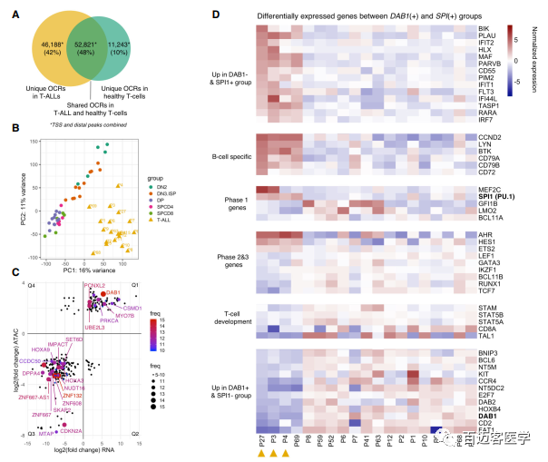 由于患者異質(zhì)性較高(圖5B),作者對(duì)每個(gè)患者進(jìn)行了DESeq2差異分析鑒定復(fù)發(fā)事件。與健康T細(xì)胞前體相比,作者在至少5個(gè)T-ALLs中鑒定出292個(gè)差異基因和差異可及性O(shè)CRs(圖5C)。102個(gè)峰/基因可及性強(qiáng)并過表達(dá),191個(gè)峰/基因可及性弱并低表達(dá)(圖5C)。4例未表達(dá)DAB1的患者(P3、P4、P27和P69)形成了一個(gè)不同的亞群其特征是SPI1過表達(dá),發(fā)育早期DN2貢獻(xiàn)率特別高(圖4C),3例患者TF SPI1(PU.1)結(jié)合位點(diǎn)可及性更高(圖4E)?;虮磉_(dá)和染色質(zhì)可及性差異分析顯示,表達(dá)SPI1的患者以基因過表達(dá)/超可及性為特征,并決定了T細(xì)胞發(fā)育的早期第一階段。這些基因包括MEF2C、MEIS1HOXA9 ,基因特征為B細(xì)胞前體如LYN、BTK、cyclin D2CD79A、CD79BCD72(圖5D)。DAB1過表達(dá)和超可及性T-ALLs趨向于T細(xì)胞發(fā)育后期2和3階段過表達(dá)基因如TCF7、LEF1RUNX1(圖5D)。綜上所述,這些數(shù)據(jù)涉及到DAB1和SPI1一個(gè)未知的相互排斥的生物學(xué)意義,并將T細(xì)胞發(fā)育階段,即兒童T- ALLs可能起源于成熟T細(xì)胞發(fā)育途徑的不同層次,盡管早期水平始終一致。