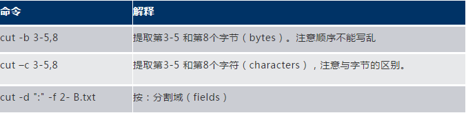 cut命令命令從文件的列剪切字節(jié)、字符、域,并將這些字節(jié)、字符,域,輸出出來,下面為幾個常見的用法: