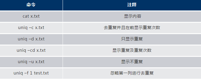 uniq需要配合sort進行使用,把重復的內(nèi)容排序到一起,以下為最常用的幾個命令實例