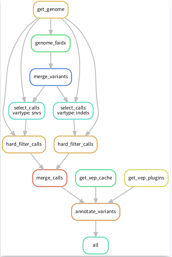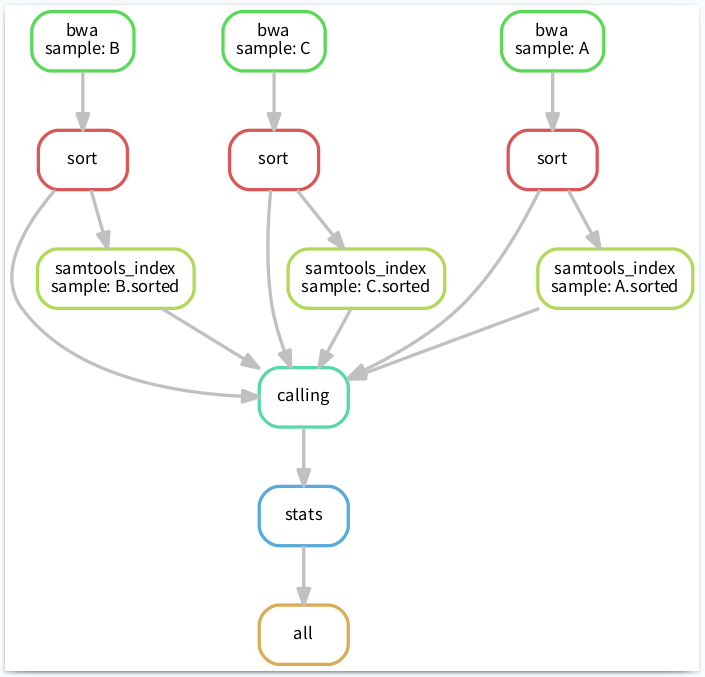 這時(shí)候就需要 Snakemake 閃亮登場(chǎng)了,因?yàn)閟nakemake可能是處理這類問題最簡(jiǎn)單、有效的一個(gè)方法了。比如將流程像下圖這樣搭建起來,清晰明了: