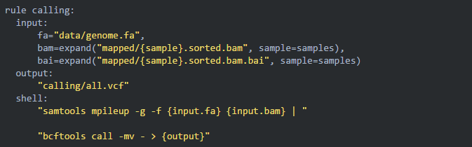 前面三步都是各個(gè)樣品批量、并行運(yùn)行同樣的步驟,所以可以全部使用通配符 {sample} 完成匹配;但在變異檢測(cè)這一步需要將所有樣本的bam文件傳遞給一個(gè)命令而不再并行,這種方法就不在適用了。針對(duì)這種情況,snakemake 有它獨(dú)特的解決辦法:
