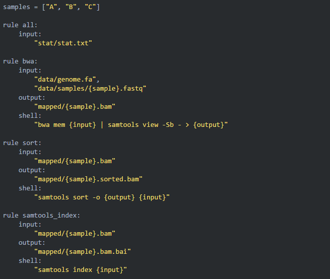 上面的 bwa 規(guī)則僅僅比對(duì)了一個(gè)樣本,可是實(shí)際項(xiàng)目中有幾十上百的樣本時(shí),我們就不能這樣直接寫樣本名來運(yùn)行了,這樣很不 pythonic。snakemake 允許使用通配符(wildcard)來批量運(yùn)行命令,示例如下: