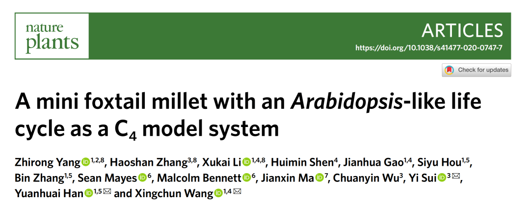 2020年8月31日,山西農(nóng)業(yè)大學(xué)雜糧分子育種團(tuán)隊(duì)與中國(guó)農(nóng)業(yè)科學(xué)院作物科學(xué)研究所等單位合作研究論文“A mini-foxtail millet with an Arabidopsis-like life cycle as a C4 model system”在線發(fā)表于國(guó)際期刊Nature Plants(IF:13.256),報(bào)道了C4禾谷類研究的理想模式植物“小米”的研究成果。山西農(nóng)業(yè)大學(xué)的楊致榮教授、中國(guó)農(nóng)業(yè)科學(xué)院作物科學(xué)研究所的張皓珊博士和山西農(nóng)業(yè)大學(xué)的李旭凱副教授為論文的共同第一作者;山西農(nóng)業(yè)大學(xué)的王興春教授、韓淵懷教授和中國(guó)農(nóng)業(yè)科學(xué)院作物科學(xué)研究所的隋毅副研究員為論文的共同通訊作者。美國(guó)普渡大學(xué)和英國(guó)諾丁漢大學(xué)等單位參與了部分研究。百邁客有幸參與了其中基因組、轉(zhuǎn)錄組及數(shù)據(jù)庫構(gòu)建工作。目前,數(shù)據(jù)庫由百邁客負(fù)責(zé)維護(hù)和運(yùn)行,暫時(shí)托管在公司服務(wù)器(http://foxtail-millet.biocloud.net/home)。