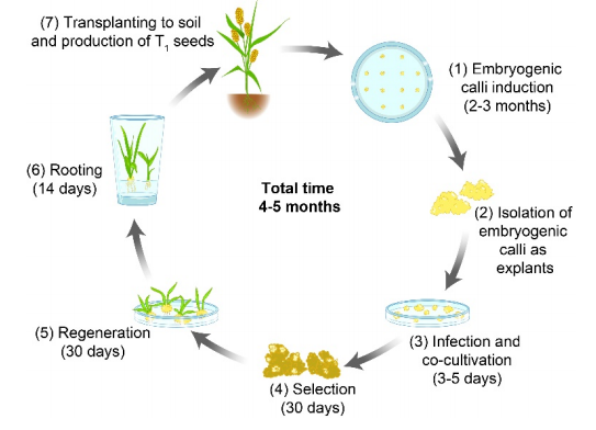 HPTNPTII標(biāo)記的13個(gè)獨(dú)立轉(zhuǎn)基因系的基因組測(cè)序證實(shí)了轉(zhuǎn)基因插入“小米”基因組的正確性,并通過PCR進(jìn)一步確定了3個(gè)檢測(cè)系的T-DNA插入位點(diǎn)。在盆栽中培育了代表8個(gè)轉(zhuǎn)基因事件的T1植株,觀察到與未轉(zhuǎn)化的“小米”植株沒有明顯的表型差異。因此,研究者建立了一個(gè)有效的方案,允許在2-3個(gè)月內(nèi)(從農(nóng)桿菌感染算起)或4-5個(gè)月內(nèi)(從成熟種子開始愈傷組織算起),完成生產(chǎn)準(zhǔn)備移植到土壤中的轉(zhuǎn)基因植物(圖9)。