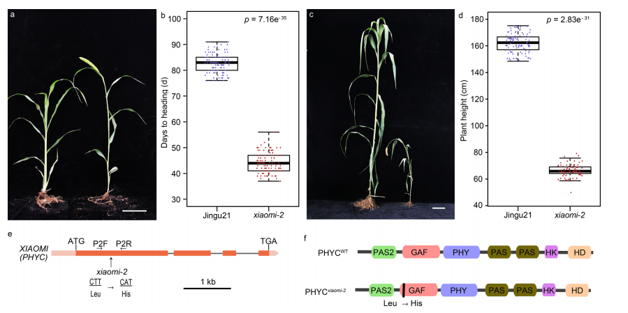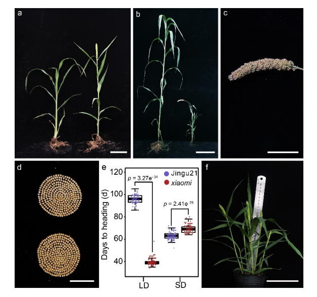 “小米”主要有以下特征:(1)表現(xiàn)出極早的開花表型:抽穗期39天(播種后天數(shù),DAS)左右,約70天內(nèi)完成了生命周期。而野生型(晉谷21,WT)的平均抽穗期約為82 天(DAS),成熟期為130 DAS(圖1b、c);(2)“小米”比野生型矮(圖1b),但結(jié)實(shí)率高12.83%,且種子大小沒有顯著差異(圖1d);(3)“小米”在短日(SD,10h光照/14h暗)條件下比長(zhǎng)日(LD,16h光/8h暗)條件下的抽穗晚了約一個(gè)月,表明“小米”的早期抽穗依賴于LD條件(圖1e)。通過延長(zhǎng)日長(zhǎng)和優(yōu)化其他條件,可以將“小米”的生命周期縮短到65天,株高約為29厘米(圖1f),每年可以在成長(zhǎng)室里完成5到6代。(4)僅需較小的種植面積,類似于種植等量的擬南芥植株。