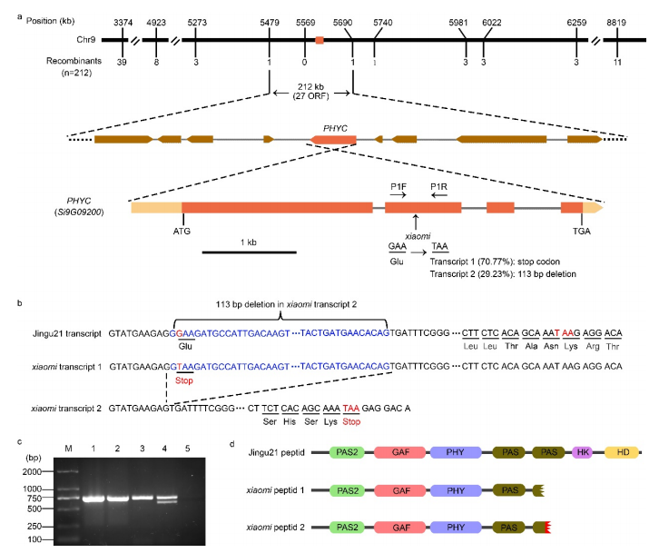 將“小米”基因組序列與經(jīng)基因組重測(cè)序生成的晉谷21基因組序列進(jìn)行比較,發(fā)現(xiàn)在定位區(qū)域只存在一個(gè)突變——“小米”基因Si9g09200的編碼區(qū)從“G”到“T”的突變,該基因編碼一種假定的PHYC蛋白(圖2a)。在所檢測(cè)的77個(gè)早期抽穗F2個(gè)體中,均為T/T純合突變體。相比之下,在256個(gè)晚抽穗個(gè)體中,92個(gè)是G/G WT純合子,另外164個(gè)是G/T雜合子,反映了基因型和表型之間的完美關(guān)聯(lián)。這種突變產(chǎn)生了一個(gè)終止密碼子,形成一個(gè)截短的蛋白質(zhì),占該基因約71%的轉(zhuǎn)錄本(轉(zhuǎn)錄本1)(圖2a-d)。這一突變還導(dǎo)致了113 bp的移碼缺失的剪接,形成了占該基因約29%轉(zhuǎn)錄本(轉(zhuǎn)錄本2)的截短蛋白(圖2a-d)。根據(jù)預(yù)測(cè),被截?cái)嗟牡鞍踪|(zhì)缺少第二個(gè)PAS結(jié)構(gòu)域的三分之二(肽1)或三分之一(肽2),以及整個(gè)HK和HD域(圖2d)。
