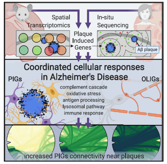 簡述:本文結(jié)合空間轉(zhuǎn)錄組(ST)和原位測序(ISS)研究人鼠大腦,揭示了兩種由淀粉樣蛋白斑沉積誘導(dǎo)的的阿爾茲海默癥(AD)多細(xì)胞基因網(wǎng)絡(luò)—-斑塊誘導(dǎo)基因(PIG)網(wǎng)絡(luò)和少突膠質(zhì)細(xì)胞基因(OLIG)響應(yīng)。