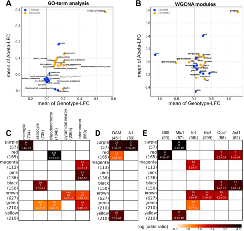 具有相似表達(dá)模式的基因很可能擁有相似的功能,因此可以通過加權(quán)基因共表達(dá)網(wǎng)絡(luò)分析(WGCNA)進(jìn)行模塊聚類。作者研究了10327個(gè)轉(zhuǎn)錄譜中變化程度*大的50%的基因,識別出12個(gè)模塊,并使用GOrilla提取了可能的生物學(xué)功能、Aβ暴露的表達(dá)變化、3月齡和18月齡的基因型、細(xì)胞特征、受影響的腦區(qū)。