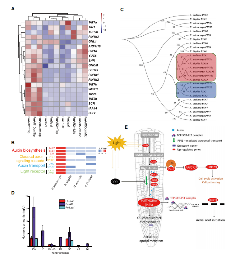 細葉榕與對葉榕顯著差異表現(xiàn)為前者有氣生根而后者沒有,為了尋找觸發(fā)氣生根的途徑,作者在氣生根尖鑒定到811個高表達基因。這些高表達的基因在一系列與運輸相關的生物過程中顯著富集。通過對PIN家族的系統(tǒng)發(fā)育分析,發(fā)現(xiàn)PIN1基因存在顯著的拷貝數(shù)變異(CNV),并確定了兩個進化的PIN1亞群。第一組(PIN1a)在兩種榕樹和擬南芥中均被鑒定到,第二組(PIN1b)僅于兩種榕樹中。RNA-seq表明,FmPIN1a在大多數(shù)被測組織中均有表達,而FmPIN1b1、FmPIN1b2FmPIN1b3在氣生根樣品中高表達。光受體CRY2和PHR2的拷貝數(shù)增加,TAR(如TAT2a、TAT2b和TAT7b)和YUC編碼基因(如YUC6)的表達增加進一步加速了IAA的積累,與對葉榕相比,細葉榕氣生根尖的內(nèi)源生長素濃度高出5倍。說明生長素的增加引發(fā)了氣生根的發(fā)育,光促進的生長素依賴途徑與氣生根的發(fā)生、生長和形態(tài)形成有關。