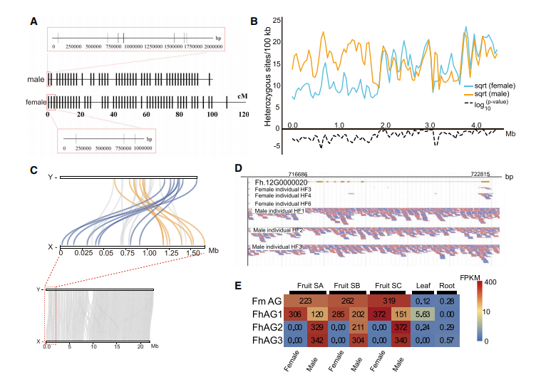 此外,作者新開發(fā)了染色體定相方法并重新組裝了X和Y染色體。X染色體和Y染色體中分別為21.9 Mb和22.6 Mb,表明Y染色體已經(jīng)擴展了700 kb(圖3C)。比較X和Y染色體,結(jié)合存在或缺失變異(PAV)分析及RNA-seq分析以及重測序比對,顯示蛋白編碼基因(Fh.12g000020)基因只存在于雄性基因組中,而不存在于雌性基因組中,是影響性別決定的主要因素(圖3E)。