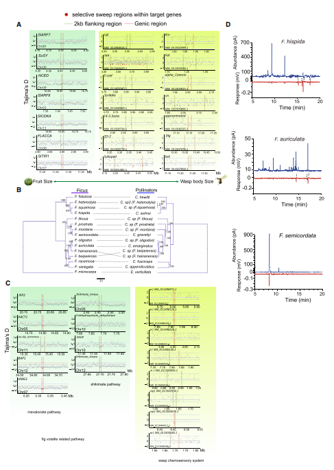 七千五百萬年來,榕樹和榕小蜂之間的專性協(xié)同進化在這個協(xié)同進化系統(tǒng)中形成了形態(tài)和生理上的相適應。榕樹在全球和當?shù)囟加袠O高的物種多樣性,同域近緣榕果物種間生殖隔離的主要原因是傳粉蜂的特異性。為了探討榕果與傳粉蜂協(xié)同進化的潛在分子機制,作者利用14個來自Sycomorus亞屬的榕樹和其相應傳粉蜂的重測序數(shù)據(jù)進行分析。系統(tǒng)發(fā)育分析表明,在這個分類水平上,寄主關聯(lián)具有很強的保守性,同時也檢測到一些寄主轉(zhuǎn)移事件。為了確定在這些協(xié)同進化的物種中可能經(jīng)歷了相互選擇和分化的候選基因,作者利用Tajima’D和SweeD分析對榕果和傳粉蜂基因組進行了選擇性清除分析,顯示在榕果和傳粉蜂中生長相關的基因、榕果揮發(fā)物相關基因和傳粉蜂化學感應系統(tǒng)相關基因受到一定的選擇作用。并通過榕小蜂對三種不同榕果釋放揮發(fā)物質(zhì)的電生理測試,支持了甲羥戊酸和莽草酸途徑在吸引特定傳粉者方面的重要作用(圖5),揭示了在這種專性互利共生中共分化的潛在分子機制。