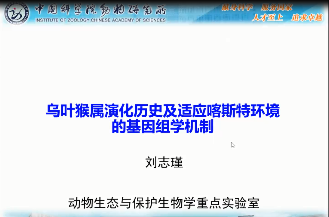 中國科學(xué)院動物研究所劉志瑾副研究員詳述了烏葉猴屬中黑葉猴種組、銀葉猴種組、郁烏葉猴種組三個種組演化地位和種群動態(tài)。并對石山葉猴和雨林葉猴兩大類群以及黑葉猴種組的分化情況進(jìn)行了深入闡述。研究最后推斷EDNRB基因是在自然選擇過程中,在白頭葉猴遺留下來的環(huán)境適應(yīng)性毛色表型的關(guān)鍵機(jī)制。劉老師的報告使相關(guān)領(lǐng)域?qū)W者對靈長類生態(tài)分類群中的基因-環(huán)境相互作用和生理-形態(tài)適應(yīng)機(jī)制有了新的認(rèn)識。