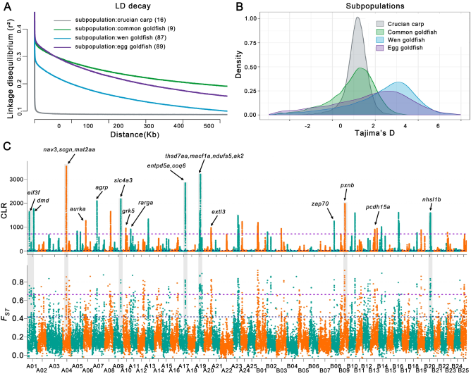 通過201個(gè)個(gè)體(16只野生鯽魚和185只代表性金魚變種,平均測(cè)序深度12.5 x)的系統(tǒng)發(fā)育樹構(gòu)建發(fā)現(xiàn)普通金魚與鯽魚親緣關(guān)系最近(圖4 A-C),進(jìn)一步結(jié)合系統(tǒng)發(fā)育樹和PCA分析確定各金魚變種的系統(tǒng)分化關(guān)系,區(qū)分普通金魚和卵金魚(無背鰭)和溫金魚(有背鰭),無背鰭金魚和有背鰭金魚進(jìn)一步分為不同的亞群。