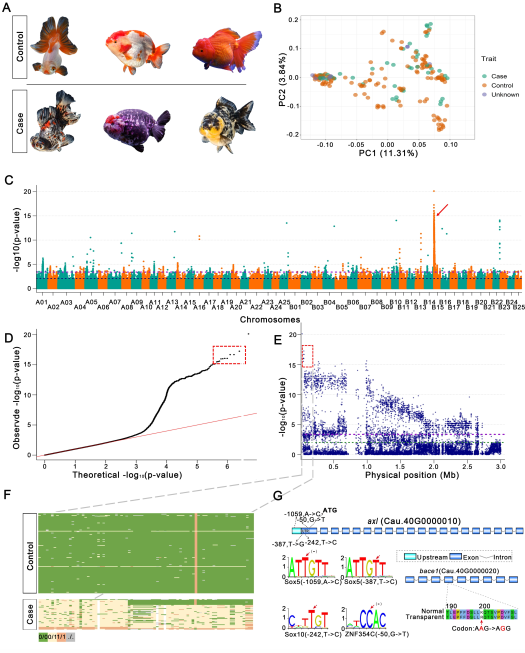 ??? 透明的金魚突變體首次記錄于1579年,是孟德爾遺傳學(xué)在魚類甚至脊椎動(dòng)物中的典型案例,在T / t基因座上的優(yōu)勢(shì)表達(dá)不完全。本研究中利用48個(gè)實(shí)驗(yàn)個(gè)體和127個(gè)對(duì)照個(gè)體進(jìn)行全基因組關(guān)聯(lián)分析(圖7 A-C),發(fā)現(xiàn)在B15染色體臂上的5個(gè)SNPs與T / t基因座上的不完全優(yōu)勢(shì)遺傳模式相吻合。與同源染色體15相比,在該區(qū)域發(fā)生了倒位。在候選區(qū)域ChrB15:28,558?153,105中,鑒定了基因Cau.B15G0000010(ChrB15:48,888?76,549),其編碼酪氨酸蛋白激酶受體UFO-like蛋白,在5′-UTR區(qū)的預(yù)測(cè)轉(zhuǎn)錄因子結(jié)合位點(diǎn)包含四個(gè)SNPs(圖7 G)。白細(xì)胞酪氨酸激酶與斑馬魚的色素細(xì)胞發(fā)育有關(guān),并且受體酪氨酸激酶家族的成員在人類黑色素瘤的發(fā)育中起著作用,盡管目前該基因家族的作用在金魚中尚不清楚。在金魚中,酪氨酸蛋白激酶受體可能調(diào)節(jié)酪氨酸激酶,從而導(dǎo)致色素沉著變化,在該區(qū)域內(nèi),編碼具有非同義單核苷酸突變的β-分泌酶1-like蛋白(bace1)的Cau.B15G0000020基因與斑馬魚和人的黑素細(xì)胞遷移有關(guān),這可能解釋在透明鱗片的金魚上出現(xiàn)黑色污跡或斑點(diǎn)。盡管功能驗(yàn)證仍在進(jìn)行中,但研究中認(rèn)為酪氨酸蛋白激酶受體是金魚T / t基因座的強(qiáng)力候選基因。