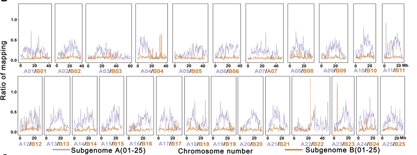 在過去的50年里,一直推測(cè)金魚基因組是四倍體。近期研究表明,鲃亞科Barbinae (2n = 50) 中的鯉魚科可能是金魚最接近的二倍體祖先,進(jìn)而形成這樣一個(gè)假說:鲃亞科(Barbinae)可能是二倍體金魚譜系的祖先種,研究中進(jìn)一步進(jìn)行了6個(gè)代表性的二倍體鲃亞科物種(包括條紋小鲃,大鱗高須魚,長(zhǎng)臀鲃,黑鰭袋唇魚,施氏魮和裂峽鲃)的全基因組鳥槍測(cè)序并進(jìn)行基因組組裝。金魚染色體可清晰分為兩個(gè)亞基因組,通過reads多序列比對(duì),發(fā)現(xiàn)金魚來自兩個(gè)祖先世系,其中一個(gè)是鲃亞科共有的,進(jìn)一步將與鲃亞科比例高的reads所在染色體定為A亞基因組(ChrA01~A25)并將其余染色體定為B亞基因組 (ChrB01~B25)(圖2)。此外,基于1個(gè)核基因的系統(tǒng)進(jìn)化分析,即結(jié)締組織生長(zhǎng)因子like基因在二倍體金魚中僅有1個(gè)拷貝,但在四倍體金魚中含有2個(gè)拷貝,結(jié)果顯示鲃亞科物種的同源基因與金魚A亞基因組同源基因聚類到一起(斑馬魚和鯉魚作外群)。研究結(jié)果表明,A亞基因組可能起源于鲃亞科內(nèi)的祖先物種,而B亞基因組的二倍體祖先可能已經(jīng)滅絕或起源于未知的鯉科魚類譜系,推測(cè)金魚的起源可能是由于異源多倍化事件。金魚的A和B亞基因組分別包含28,133和26,141個(gè)基因。同時(shí)通過金魚10個(gè)不同組織的RNA-seq測(cè)序,探索了A和B兩個(gè)亞基因組之間的差異表達(dá),發(fā)現(xiàn)同源基因在兩個(gè)亞基因組之間表現(xiàn)出不對(duì)稱的表達(dá)模式,而全基因組范圍內(nèi)的表達(dá)水平總體上更偏好A亞基因組。