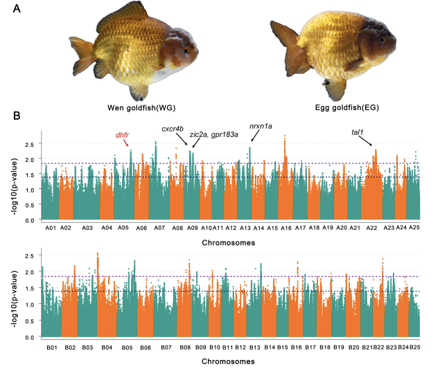 背鰭作為金魚一重要的表型特征,在不同變種中形態(tài)不一,背鰭是區(qū)分Wen金魚和Egg金魚的顯著特征,背鰭的縮小是Egg金魚進(jìn)化的關(guān)鍵特征。通過Wen金魚和Egg金魚雜交后代F1背鰭性狀分離比,暗示了了背鰭特征受多個(gè)基因位點(diǎn)控制,可能具有母體遺傳效應(yīng)。對(duì)96只有背鰭和87只無背鰭金魚的全基因組關(guān)聯(lián)分析GWAS研究分析發(fā)現(xiàn)跨越13條染色體上的8.96 Mb區(qū)域上的378個(gè)基因與背鰭性狀相關(guān)(圖6),85.2% (322)個(gè)基因位于A亞基因組,大部分位于五條染色體上,包括ChrA09,ChrA07,ChrA22,ChrA16和ChrA05,比位于B亞基因組上的背鰭相關(guān)基因的數(shù)量高得多,這表明背鰭相關(guān)基因不對(duì)稱的亞基因組分布,GO和KEGG分析表明,該性狀的候選基因可能參與了“細(xì)胞表面受體信號(hào)傳導(dǎo)”途徑,“信號(hào)轉(zhuǎn)導(dǎo)”,“跨膜轉(zhuǎn)運(yùn)”,“骨骼系統(tǒng)發(fā)育”和“初級(jí)代謝過程和器官氮化合物代謝過程”。進(jìn)一步通過與斑馬魚直系同源基因基因敲除品系表現(xiàn)出的突變表型分析發(fā)現(xiàn),二氫葉酸還原酶(dhfr)可能在某種程度上與魚鰭是否存在相關(guān),該基因可能在金魚人工選擇過程中,在有無背鰭這一表型中發(fā)揮重要作用。