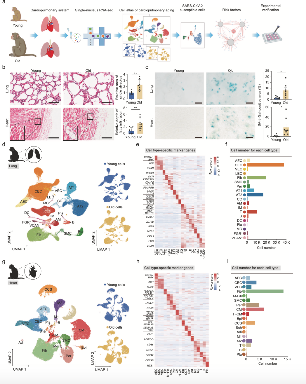 分別對兩組樣品選取肺和心臟組織進(jìn)行單細(xì)胞核測序(圖1a)。與幼齡猴肺相比,老年猴肺的特征是肺泡增大、纖維化增加和脂肪沉積(圖1b)。此外,在老年猴心臟中出現(xiàn)脂肪浸潤。同時,衰老的肺和心臟表現(xiàn)出較高水平的半乳糖苷酶(SA-β-Gal)染色,而這個是細(xì)胞衰老的特征(圖1c)。通過單細(xì)胞核測序,共獲得150000個細(xì)胞,利用UMAP聚類分析,鑒定了具有不同細(xì)胞特征的19中肺細(xì)胞和18中心臟細(xì)胞。利用已知細(xì)胞特征進(jìn)行再次鑒定,在肺中,鑒定到了AT1和AT2、纖毛細(xì)胞(CCs)、內(nèi)皮細(xì)胞等,并鑒定出7中免疫細(xì)胞,包括AMs、IMs、B細(xì)胞、T細(xì)胞等(圖1d)。在心臟中,鑒定了肥厚性心肌細(xì)胞(H-CMs)、心外膜細(xì)胞、兩種神經(jīng)傳導(dǎo)細(xì)胞等,并鑒定出5種免疫細(xì)胞(圖1g)。通過GO數(shù)據(jù)庫注釋和轉(zhuǎn)錄組分析顯示,細(xì)胞類型在靈長類動物衰老過|中沒有明顯影響。研究顯示作者的數(shù)據(jù)代表了年輕和年老靈長類動物肺和心臟的單核細(xì)胞轉(zhuǎn)錄圖譜。