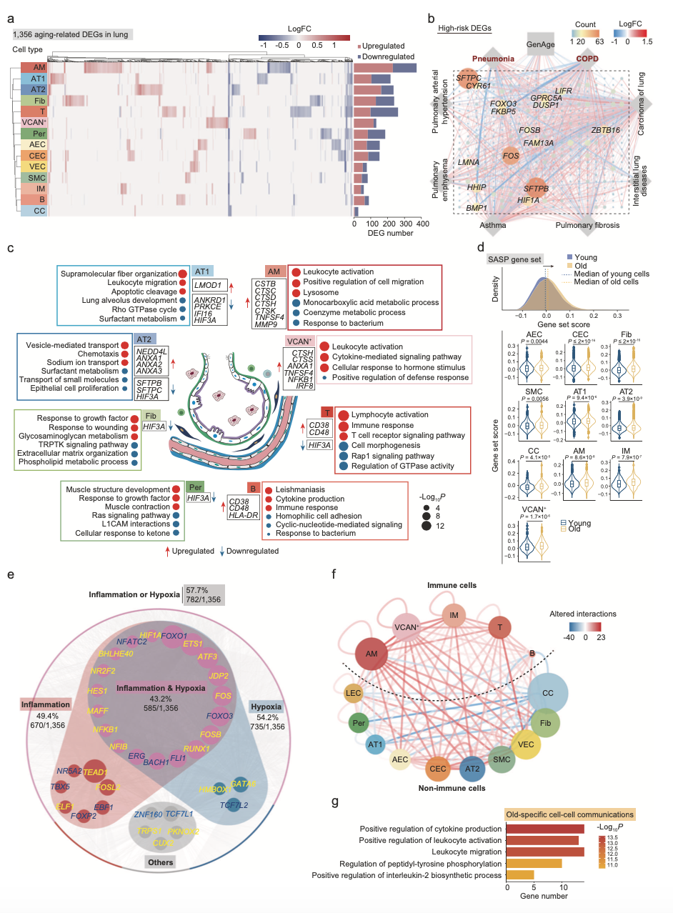 為了闡明細(xì)胞水平上與衰老相關(guān)的分子機(jī)制,作者在個性肺細(xì)胞中識別和衰老相關(guān)的轉(zhuǎn)錄組變化。通過差異分析(| logFoldChange(logFC)| 0.25,調(diào)整后的P值<0.05)顯示,共獲得1356個差異基因(圖2a)。衰老過程中受影響最大的細(xì)胞包括AMs、T細(xì)胞、成纖維細(xì)胞、AT1和AT2,在老年和青年肺亞型中分別有372、262、239、235和217個差異基因。通過數(shù)據(jù)庫注釋,這些基因包含了肺部疾病(COPD、肺炎、肺纖維化、哮喘等)的熱點(diǎn)基因。下調(diào)的DEGs參與上皮細(xì)胞增值、止血和表面活性物質(zhì)代謝(圖2c),提示衰老過程中肺功能受損。此外,SASP相關(guān)基因在10中類型細(xì)胞中過表達(dá)(圖2d),表明老年肺以細(xì)胞應(yīng)激和慢性炎癥為特征。具體來說,上調(diào)的DEGs與囊泡介導(dǎo)的轉(zhuǎn)運(yùn)有關(guān)(圖2c),這可能構(gòu)成病毒內(nèi)化的一個貢獻(xiàn)者。在蛋白水平上,通過免疫熒光分析證實了缺氧誘導(dǎo)的轉(zhuǎn)錄因子HIF1在老年肺中表達(dá)上調(diào),提示老年肺可能發(fā)生明顯的缺氧應(yīng)激反應(yīng),這可能是導(dǎo)致深度衰老的原因之一。通過上皮細(xì)胞和免疫細(xì)胞的轉(zhuǎn)錄特征分析,觀察到21個囊泡介導(dǎo)的轉(zhuǎn)運(yùn)相關(guān)基因在AT2細(xì)胞中,這可能與病毒的進(jìn)入、組裝等相關(guān)。因此,這些結(jié)果揭示了衰老可能導(dǎo)致肺泡上皮屏障功能衰退以及病毒防御能力受損。