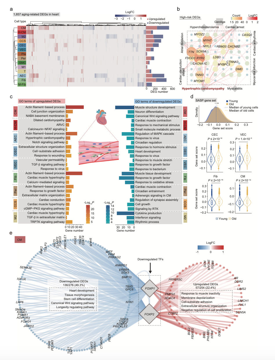 總的來說,老年肺組織中許多免疫細(xì)胞類型的比例增加,包括肥大性細(xì)胞和漿細(xì)胞,他們分泌細(xì)胞因子和抗體導(dǎo)致年齡相關(guān)性炎癥、慢阻肺病和肺纖維化的比例增加。 為了探索衰老心臟中細(xì)胞特異性的分子機(jī)制,作者篩選出了1857個差異基因(|logFC| > 0.25, P value < 0.05)(圖3a),其中數(shù)十個基因是肥厚型心肌病的熱點(diǎn)基因(圖3b)。反映了心臟中與年齡相關(guān)的基因表達(dá)變化與老年人心臟病高發(fā)之間的緊密聯(lián)系。