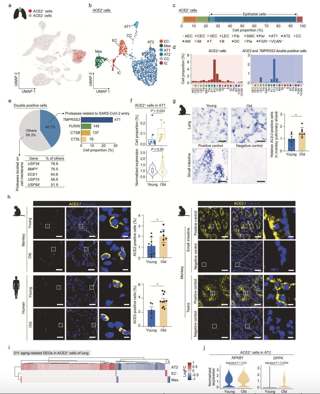 為了識別可能被SARS-CoV-2靶向的細(xì)胞類型,作者分析了ACE2、TMPRSS2、FURIN和其他可能的輔助蛋白的細(xì)胞特異性的表達(dá)模式。在肺中,ACE2在AT2(7%)、AT1(1%)、纖毛細(xì)胞(3%)等類型中表達(dá)(圖4b-d),另外還發(fā)現(xiàn),一小部分內(nèi)皮細(xì)胞表達(dá)ACE2、AECs、CECs均表達(dá)為0.2%,AT2和AT1中檢測到大多數(shù)ACE2和TMPRSS2雙陽性細(xì)胞。組織蛋白酶家族成員的FURIN、CTSB、CTSL等膜錨定蛋白酶與ACE2共表達(dá)。這些數(shù)據(jù)確認(rèn)AT2和AT1是肺中COVID-19的易感細(xì)胞類型。有趣的是,衰老細(xì)胞中ACE2陽性的AT1細(xì)胞比例增加了約2倍。更重要的是,衰老過程中,NHP和人肺部的免疫染色均證實了肺泡周圍ACE2陽性細(xì)胞的增加,提示隨著年齡的增長,肺泡表面更容易感染SARS-CoV-2的細(xì)胞比例增加。