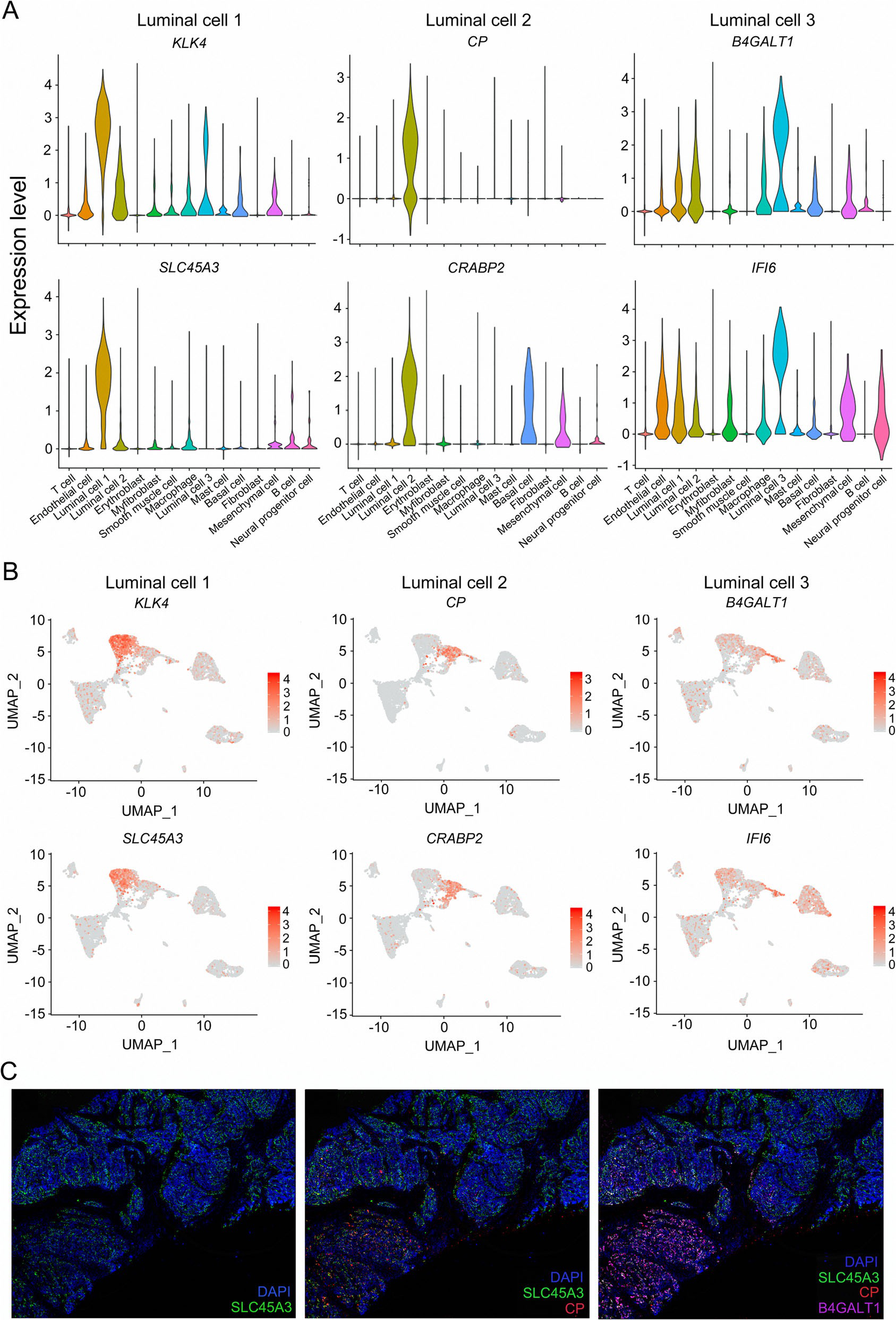 在本文的數(shù)據(jù)中,根據(jù)管腔標(biāo)志物在PCa樣本中的高表達(dá)水平,確定了3種類型的管腔細(xì)胞,包括角蛋白8(KRT8)和角蛋白18(KRT18)。為了表征這些管腔簇,作者用VlnPlot和FeaturePlot分別檢測(cè)了各自標(biāo)記基因的表達(dá)模式。結(jié)果表明,這些溶解酶(k4a)可作為特異性的載體(k4a)表達(dá)于細(xì)胞內(nèi)(k4a4)。銅藍(lán)蛋白(CP)在2型管腔細(xì)胞中唯一表達(dá),而細(xì)胞維甲酸結(jié)合蛋白2(CRABP2)在間充質(zhì)細(xì)胞以及2型和3型管腔細(xì)胞中高表達(dá),這表明CP更適合2型管腔細(xì)胞(圖2a,b)。與其他簇相比,3型管腔細(xì)胞表現(xiàn)出更高水平的β-1,4-半乳糖基轉(zhuǎn)移酶1(B4GALT1)和干擾素α誘導(dǎo)蛋白6(IFI6)的表達(dá)水平,表明B4GALT1和IFI6可以識(shí)別這些細(xì)胞(圖2a,b)。為了研究PCa組織中每種類型管腔細(xì)胞的細(xì)胞學(xué)定位,我們使用抗SLC45A3、抗CP、抗B4GALT1抗體進(jìn)行免疫染色,并用DAPI復(fù)染組織切片(圖2c)。SLC45A3在前列腺組織的大多數(shù)管腔細(xì)胞中表達(dá)(圖2c)。相反,在一小部分管腔細(xì)胞中檢測(cè)到低表達(dá)水平的SLC45A3(圖2c)。不同類型的癌細(xì)胞在T1區(qū)的發(fā)育不完全相同(圖2 c)。
