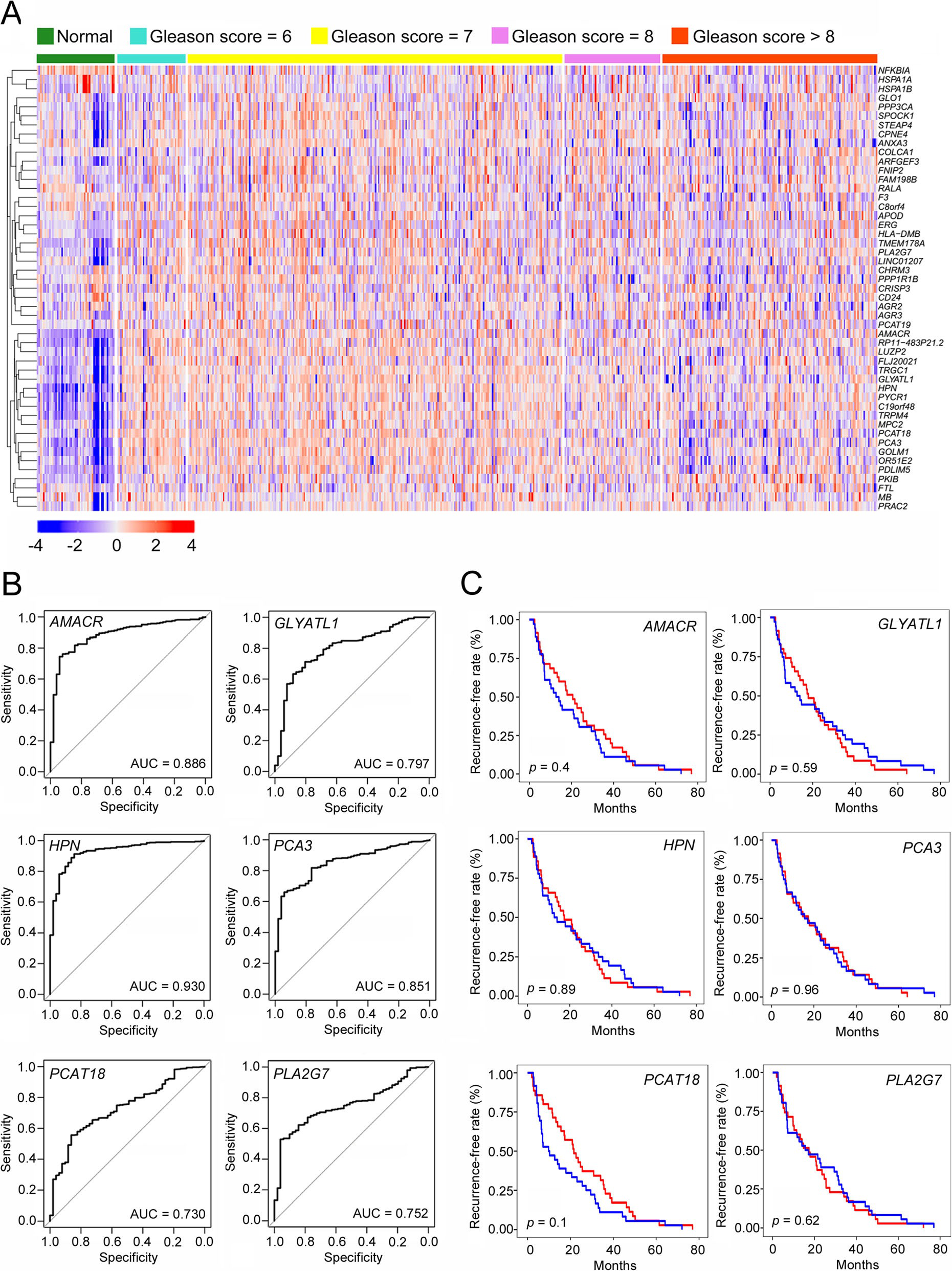 分析TCGA患者Ⅰ型管腔亞群的臨床相關(guān)性及其標(biāo)記基因的表達(dá)模式。正常前列腺中大多數(shù)1-4亞組標(biāo)記基因的表達(dá)水平與PCa組織中的相似甚至更高。相比之下,第5亞組的標(biāo)記基因在PCa組織中高表達(dá),尤其是在Gleason評(píng)分為6或7的患者中,這表明在PCa的發(fā)生和早期發(fā)展中有潛在的作用(圖6a)。通過(guò)ROC分析,我們進(jìn)一步鑒定了5亞組中6個(gè)特異性和敏感性最高的標(biāo)記基因,包括AMACR、GLYATL1、HPN、前列腺癌基因PCA3,前列腺癌相關(guān)轉(zhuǎn)錄物18(PCAT18)和磷脂酶A2第七組(PLA2G7)(圖6b)?;?-基因集的ROC分析顯示了很強(qiáng)的PCa預(yù)測(cè)能力,AUC得分為0.937。此外,這些基因的表達(dá)模式不僅區(qū)分了PCa與正常前列腺,而且區(qū)分了早期PCa(Gleason評(píng)分=6)和高度惡性PCa(Gleason評(píng)分≥8)。許多PCa患者在1-2年內(nèi)表現(xiàn)出抗藥性,并復(fù)發(fā)為晚期PCa,如CRPC。第5亞組可能有助于PCa復(fù)發(fā)。然而,Kaplan-Meier分析顯示,這些基因在生化復(fù)發(fā)中沒(méi)有明顯的預(yù)測(cè)能力,無(wú)論是單獨(dú)的還是作為一個(gè)基因集(圖6c)。總之,第5亞組的惡性細(xì)胞是PCa診斷和分層的關(guān)鍵,但與生化復(fù)發(fā)無(wú)關(guān)。