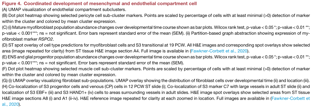 轉錄標簽通常對應于結構特征。在EC中可以清楚地看到這一點,將EC分為靜脈,動脈和淋巴管類型,并通過血管大小進一步區(qū)分(Figure4?A;TableS1)。在發(fā)育過程中,觀察到了從小血管到大血管的過渡,反映了腸道血管生成(Figure S4?A)。確定了驅動這種變化的TF網絡,例如動靜脈分化器HEY1SOX13。成年ST的脈管系統(tǒng)很容易識別成年EC和胎兒EC信號(Figure S4?B)。與EC相對的,周細胞亞型由血管生成驅動因子PRRX1,THBS4ANGPT2)定義(Figure 4?B;table S1)。ANGPT2是EC-周細胞RL相互作用的關鍵調節(jié)因子,已證實其位于胎兒脈管系統(tǒng)中(Figure S4C)。盡管EC隔室與8 PCW處存在的大血管細胞截然不同,但周細胞種群顯示出發(fā)育滯后。為了了解這些分化動力學,研究人員將G2M和S期周細胞與G1期細胞進行了比較,發(fā)現(xiàn)在較早時間點的大多數細胞是高度循環(huán)的祖細胞(Figure S4?D)。這些種群與成纖維細胞和原始的ACTA2?+細胞共享轉錄特征,這一結果受到軌跡分析的支持(Figure S4?E)。綜上所述,提出了早期成纖維細胞向周細胞的轉變,然后是來自未成熟WNT6表達細胞的第二波周細胞增殖-分化。16 PCW時,成熟的成肌纖維細胞表現(xiàn)出相似的發(fā)育滯后(Figure 4?Ci;table S1)。文獻表明腸道成肌纖維細胞可能來自多種來源,并且圖形抽象顯示成熟的成肌纖維細胞類似于肌肉細胞,在特定基因(例如RSPO2,F(xiàn)igure 4?Cii)中存在明顯差異。然而,肌成纖維細胞祖細胞卻表現(xiàn)出來自成纖維細胞和周細胞的梯度譜;在19 PCW的ST中,它們占據了與過渡間質細胞相鄰和重疊的層。(Figure 4?D和S4?E)。