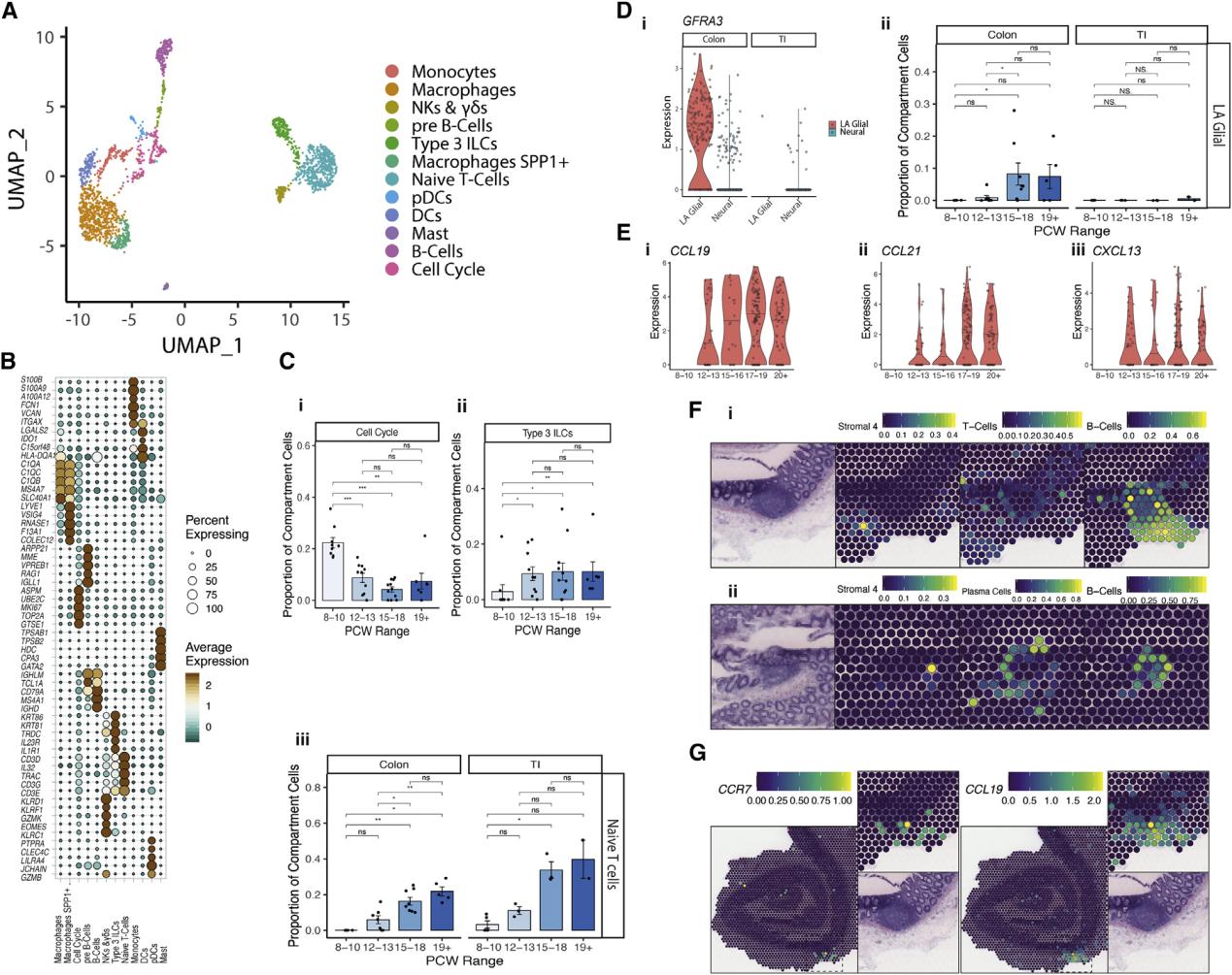 胎兒ILC3表達IL7RA和ID2(TableS1),這對小鼠子宮Peyer’s斑塊(PPs)的形成至關重要,因此將這些細胞區(qū)分為3型淋巴組織誘導劑(LTi)。PP的形成是一個LTi細胞、EC和基質細胞之間相互協(xié)調作用的過程。此外,鼠類研究顯示其還需要RET/ARTN/GFRA3神經軸,而GFRA3缺乏會導致PP發(fā)育受損。腸道相關淋巴樣組織(GALT)的形成被認為在出生前以PPs的形式出現(xiàn)在SI體內,而在出生后以結腸的形式出現(xiàn)。相反,在此,研究人員確定了一個獨特的結腸而不是SI特異的神經膠質種群,它是發(fā)育過程中唯一的GFRA3來源,并在15 PCW時擴展(Figure6 D),表明在人類結腸發(fā)育過程中可能存在類似的神經免疫回路。