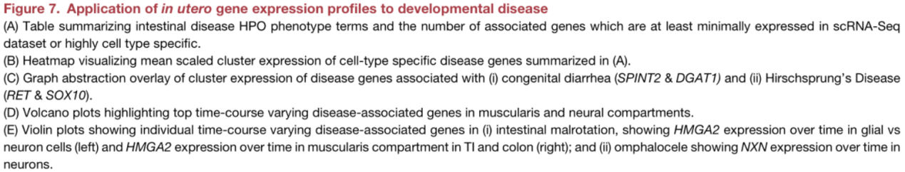 ????先天性腸道疾病的發(fā)病機制仍然是未知的,因為缺乏遺傳缺陷的基礎,而且子宮內早期會發(fā)生一些異常。腸道腹側突出,伸長,旋轉和重新定位都發(fā)生在妊娠的前三個月,并且偏差可能導致諸如食管膨出等發(fā)育異常。為了揭示可能導致先天性腸道疾病的關鍵時間轉錄缺陷,研究人員將數據與人類表型本體論(HPO)中注釋了遺傳表型的圍產期腸道疾病的分類列表相關聯(lián)。通過將749個已知的疾病基因與scRNA-seq數據整合在一起,將先天性疾病與表型聯(lián)系起來,這些表型可能通過高度細胞類型特異性缺陷(Figure7A和Figure7B)表現(xiàn)出來,并導致腸道、腹側、會陰、神經節(jié)、炎癥或腫瘤病理障礙(Figure7 A)。