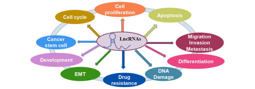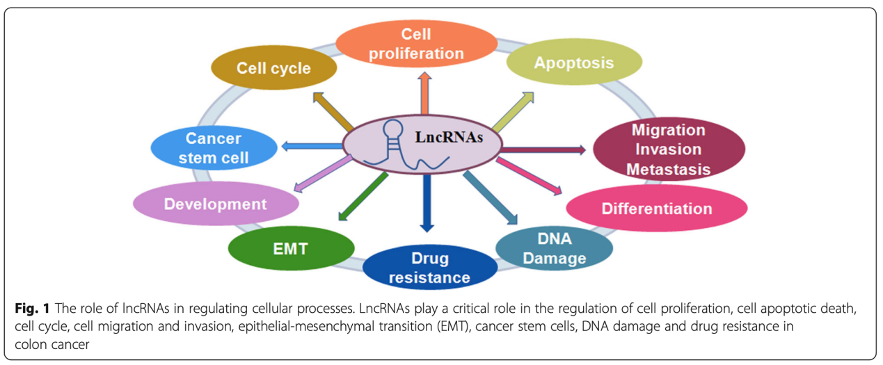 越來越多的證據(jù)表明,lncRNA在結(jié)腸癌的發(fā)生和發(fā)展中起著至關(guān)重要的作用,一項(xiàng)研究使用TCGA數(shù)據(jù)集的RNA測(cè)序數(shù)據(jù)在結(jié)腸腫瘤中鑒定了大約200個(gè)差異表達(dá)的lncRNA。LncRNA與患者預(yù)后,細(xì)胞增殖,細(xì)胞凋亡,細(xì)胞轉(zhuǎn)移和侵襲,細(xì)胞周期,上皮-間質(zhì)轉(zhuǎn)化(EMT),癌癥干細(xì)胞(CSC)和耐藥性相關(guān)(圖1)。