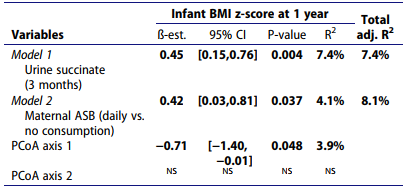 確定母親ASB消耗量與嬰兒BMI之間的聯(lián)系,本文結(jié)果表明孕婦懷孕期間食用ASB可能會影響嬰兒腸道微生物群落的建立,偏離之前所描述的典型的微生物群落成熟軌跡(表2和圖3a);與一歲時嬰兒BMI增加有關(guān),這可能是琥珀酸介導(dǎo)的(表3)。母親ASB的使用對嬰兒微生物的影響明顯小于其他已知因素,如母乳喂養(yǎng)、分娩方式、種族、嬰兒年齡和生產(chǎn)時抗生素(圖3a)。本文對100名嬰兒腸道菌群組成和功能進(jìn)行了研究,發(fā)現(xiàn)母親懷孕期間食用ASB可能對嬰兒出生后一年內(nèi)的腸道菌群發(fā)育和體重指數(shù)產(chǎn)生不可預(yù)見的影響。