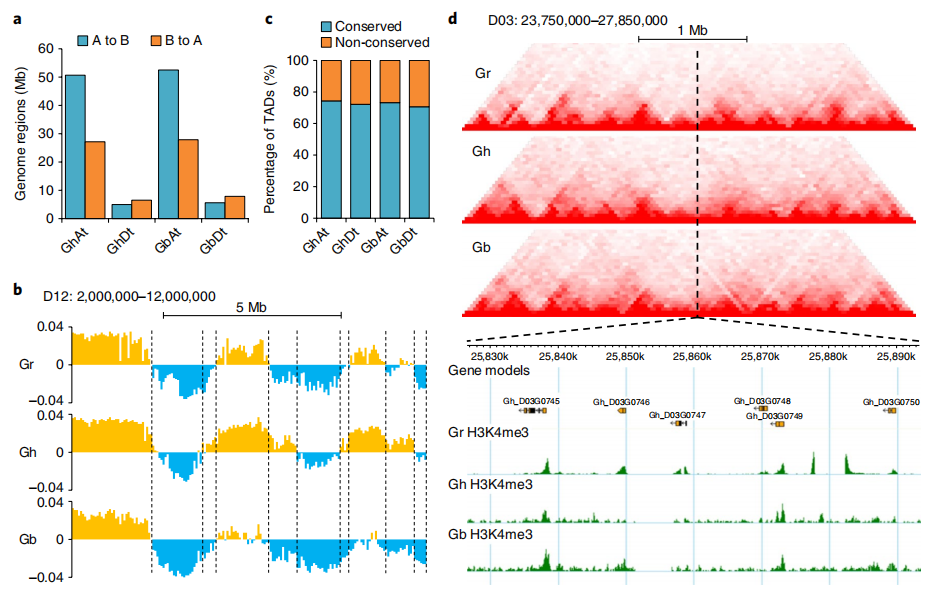 與祖先材料做研究比較更是多倍體中亙古不變的話題。物種在由祖先進(jìn)化、加倍而成現(xiàn)代多倍體材料的過(guò)程中,三維結(jié)構(gòu)發(fā)生如何的變化,是否引起相關(guān)功能的差異?例如相比于二倍體亞洲棉陸地棉和海島棉的A/B compartment比較分析,發(fā)現(xiàn)存在大量A到B的轉(zhuǎn)換,以及一定區(qū)域出現(xiàn)了B到A的轉(zhuǎn)換。同時(shí)相對(duì)于祖先基因組,亞基因組發(fā)生了不同程度的Compartment的轉(zhuǎn)換,At亞基因組轉(zhuǎn)換明顯高于Dt。