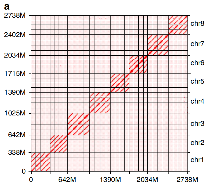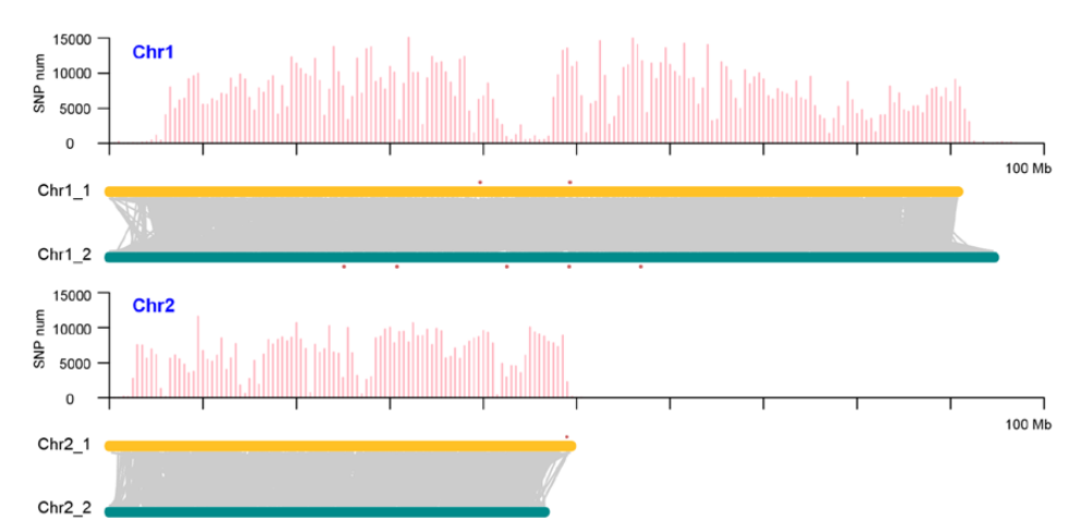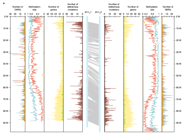 隨著單倍型的解析,不少研究發(fā)現(xiàn)在同源染色體間有大量的變異信息,而這些突變累積很可能引起等位基因的有害/有益替代。從而可以對(duì)亞基因組(同源染色體)間基因含量、GC含量、基因結(jié)構(gòu)、重復(fù)元件分布等比較、亞基因組間結(jié)構(gòu)變異(倒置、易位),結(jié)合TE分布等進(jìn)行亞基因組(同源染色體)間差異分析。