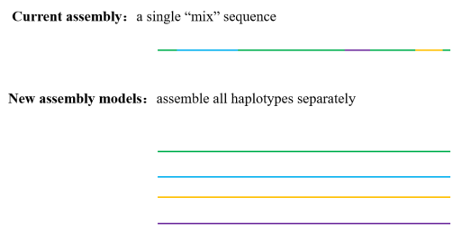 同源多倍體是指所有染色體組來(lái)源于一個(gè)個(gè)體的染色體組自我復(fù)制或同一個(gè)物種內(nèi)不同個(gè)體間的雜交與多倍化。通常二倍體基因組裝出單套基因組,異源四倍體能組裝出兩套基因組。而由于早期的技術(shù)限制,同源多倍體物種往往只能組裝1-2套(例如2017年甘薯基因組)。隨著技術(shù)的發(fā)展以及研究的深入,研究者發(fā)現(xiàn)僅單套的基因組數(shù)據(jù)難以完全演示該物種的全面信息。尤其是一些同源多倍體的物種,同源染色體之間不同遺傳位點(diǎn)的組合對(duì)生物表型有重要影響,如動(dòng)植物中的雜種優(yōu)勢(shì)、某些物種雜交不育現(xiàn)象等。單倍型等位基因間差異對(duì)基因表達(dá)、功能及其表型都有著重要影響,大多數(shù)雜交品種的優(yōu)勢(shì)表型都受等位基因調(diào)控。