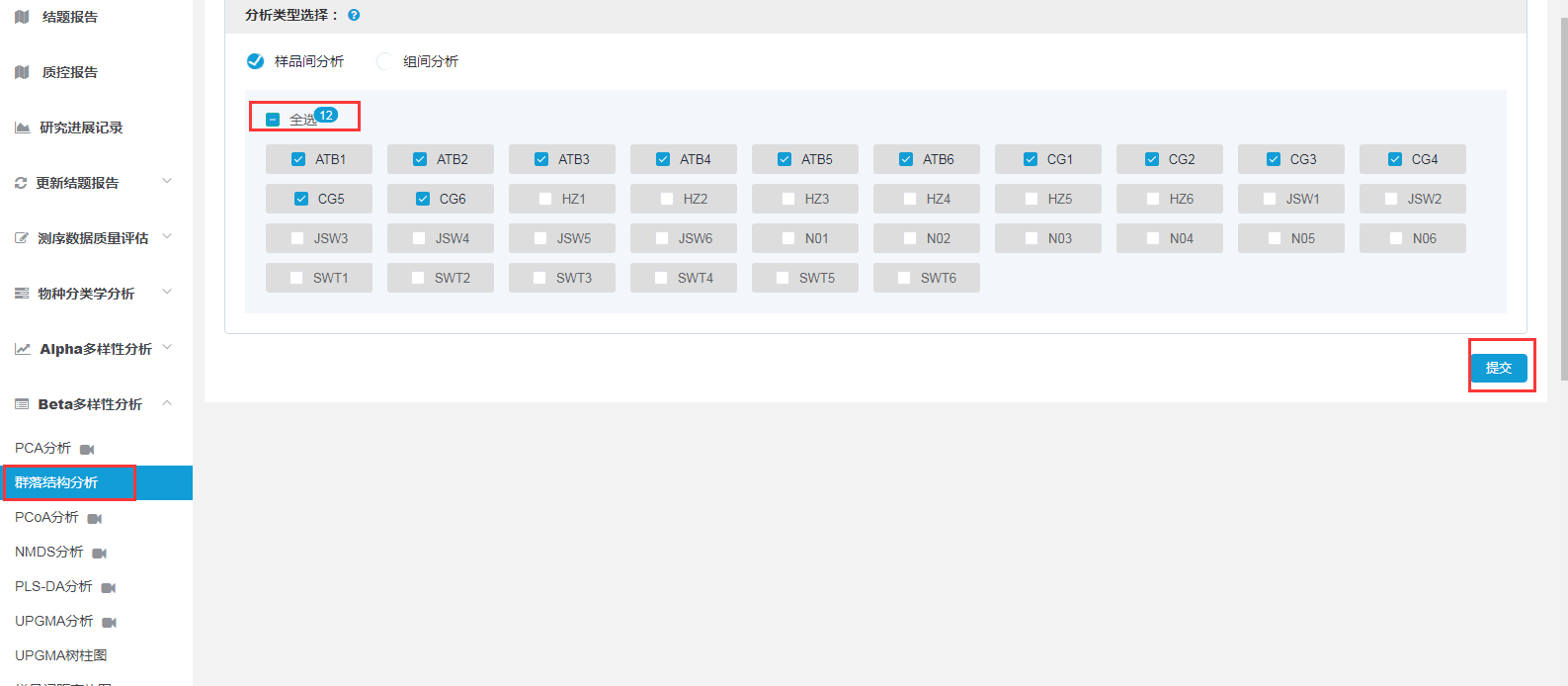 云平臺(tái)上關(guān)于群落結(jié)構(gòu)分析的操作非常簡單,打開結(jié)題報(bào)告后點(diǎn)擊“Beat多樣性分析”中的群落結(jié)構(gòu)分析,選中需要分析的樣品點(diǎn)擊提交,然后可以在分析記錄界面查看分析結(jié)果(由于會(huì)做999次重復(fù)計(jì)算,大家耐心等待哦)。