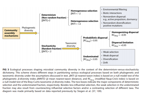 微生物群落生態(tài)學(xué)的一個(gè)主要目標(biāo)是了解構(gòu)成跨時(shí)空物種豐度模式的過程。確定性和隨機(jī)性兩種類型的過程會(huì)影響群落的聚集。確定性過程與生態(tài)選擇相關(guān),隨機(jī)過程包括不可預(yù)測的擾動(dòng)、概率性的散布和隨機(jī)的出生-死亡事件等,這些變化不是由環(huán)境決定的適應(yīng)性結(jié)果。通過零模型量化群落的絕對系統(tǒng)發(fā)育距離與隨機(jī)系統(tǒng)發(fā)育距離的偏離度,偏離程度越大,群落受確定性因素的影響越大,偏離度越小,群落受隨機(jī)性因素的影響越大。通常使用βNTI(最近種間親緣關(guān)系指數(shù))以評估不同時(shí)空尺度下隨機(jī)性和確定性過程對微生物群落組裝的影響。