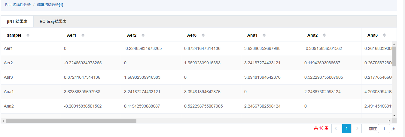 分析結(jié)果包含2個(gè)表格,分別記錄兩兩樣品之間βNTI和RCbray的值。