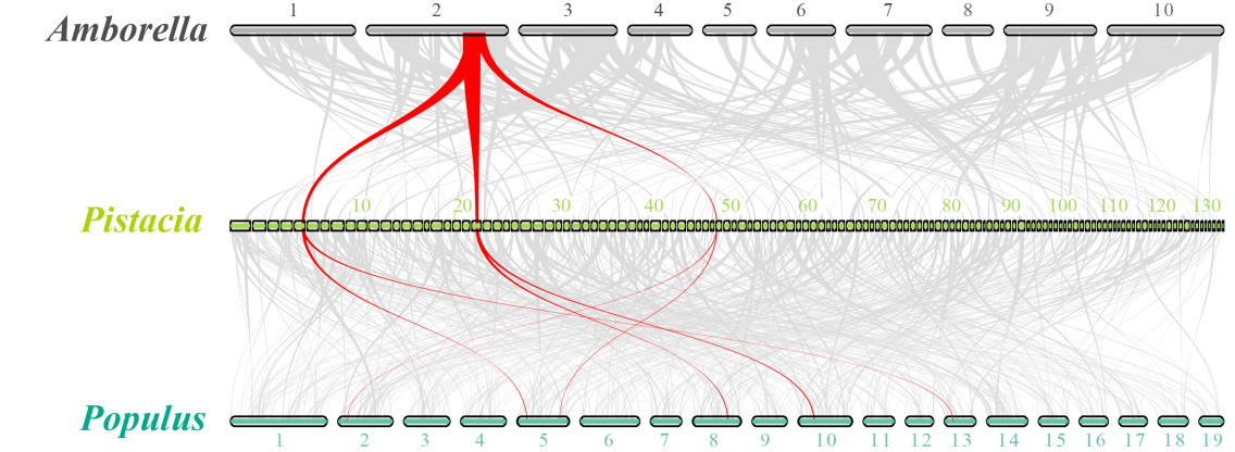 如2019年百邁客合作發(fā)表于《Genome Biology》開心果基因組文章事例所示:每個(gè)無油樟區(qū)域?qū)?yīng)三個(gè)開心果區(qū)域,每個(gè)開心果區(qū)域?qū)?yīng)有兩個(gè)毛果楊區(qū)域,暗示了開心果在毛果楊之外又發(fā)生了一次獨(dú)立的復(fù)制事件。