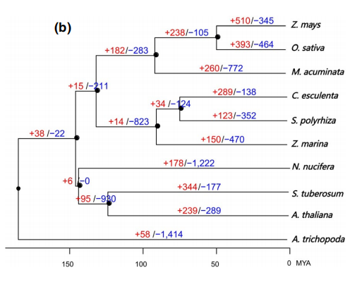 (8)全基因組復(fù)制事件加上前期已有研究物種或是研究較為清晰的物種作為比對(duì)(葡萄或無油樟可作為內(nèi)參)。