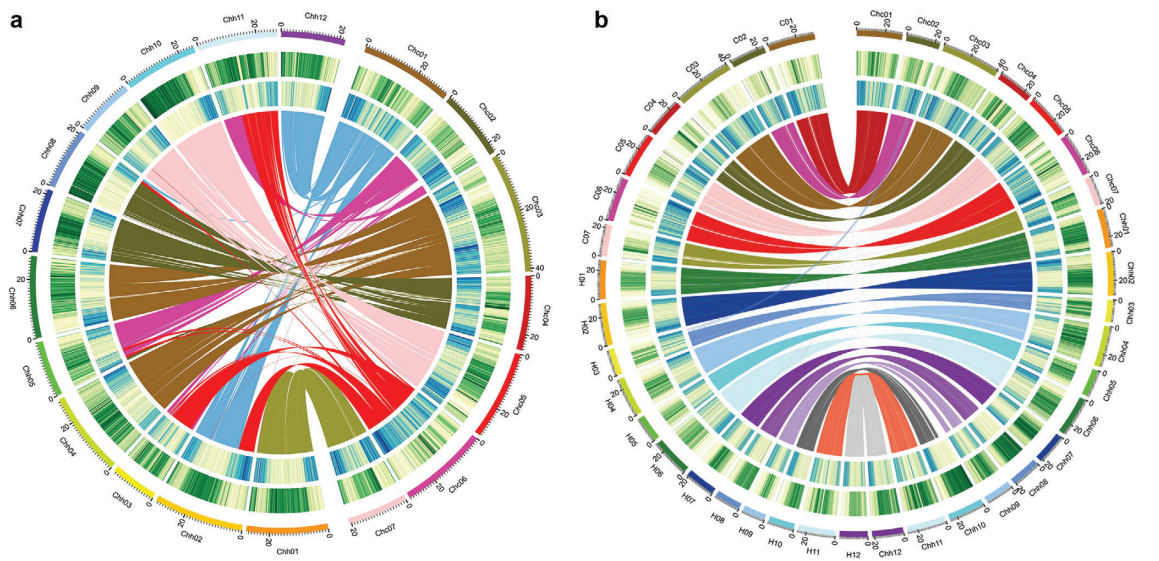 作者通過PacBio+BioNano+Hi-C+Illumina共組裝獲得530.8?Mb基因組(≈67%流式評估大?。弧?7% survey評估大?。槐葘Πl(fā)現(xiàn)未裝出的為重復(fù)序列),contig N50=6.5?Mb,并將組裝的基因組序列掛載至19條假染色體上(掛載率97.23%;定序與定向率93.33%)(表1)。通過與二倍體C.sativus (CC)和C.hystrix(HH)染色體的C01–C07和H01–H12對應(yīng),將C.×hytivus染色體命名為Chc01–Chc07和Chh01–Chh12(圖1)。