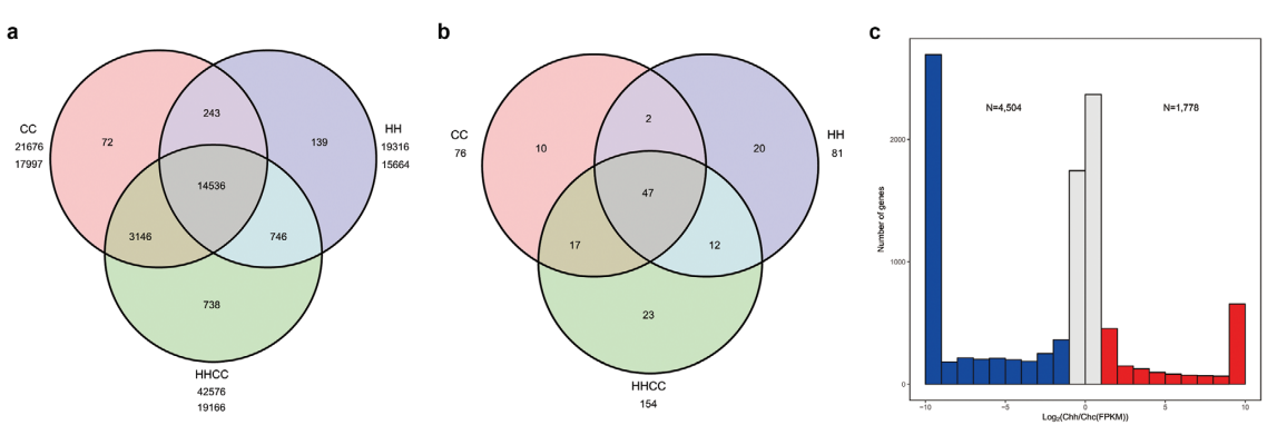 與已測序的栽培黃瓜基因組一樣,金瓜中大部分的TE為長末端重復(fù)序列。Chytivus(S14)的Chc亞基因組(SubC)含有的TEs少于二倍體C.sativus(CC)基因組,而Chh亞基因組(SubH)保持了幾乎相同的不同類型TEs的含量和比例。共預(yù)測了45687個基因,平均基因長3846bp,每個基因有5.26個外顯子。BUSCO評估結(jié)果為90.90%,CEGMA評估結(jié)果為97.82%。在CC和HH二倍體基因組中鑒定的18882個同源基因家族中,在C.×hytivus(S14)異源四倍體中也鑒定了18428個(97.60%)(圖2)。