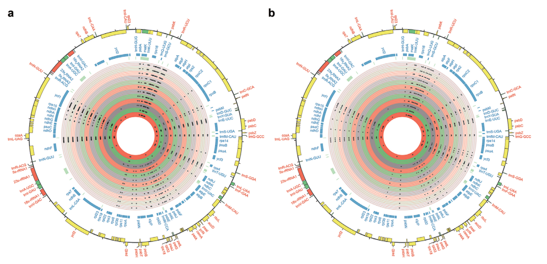 為了區(qū)分其效果,作者分別在種間雜種F1、金瓜初世代S0和其他早期世代(S4~S13)中對S14世代中預(yù)測的157個確認(rèn)缺失的基因進(jìn)行鑒定。結(jié)果表明,F(xiàn)1中有102個基因缺失,表明種間雜交事件發(fā)生后,核基因組序列立即被消除。而F1中有個別缺失的基因在S0中再次出現(xiàn),表明基因組加倍在異源多倍體中的作用與種間雜交截然不同。比較DNA序列分析顯示,相對于HH的葉綠體基因組,F(xiàn)1、S0和S4~S13的葉綠體基因組中共有195個SNPs和100個IndDels(圖4)。其中絕大多數(shù)SNPs(73.85%)和IndDels(73%)在F1中檢測到,推測多倍體中被廣泛發(fā)現(xiàn)的亞基因組優(yōu)勢現(xiàn)象在種間雜交過程中就已經(jīng)基本確定了,并在后續(xù)的進(jìn)化過程逐漸累積。而在二倍體化過程中,基因組的變化也主要發(fā)生在最初的幾個世代(S0~S3),之后的世代中僅觀察到零星的核序列丟失(基因丟失),并且葉綠體基因組中沒有發(fā)現(xiàn)新的SNPs或InDels。