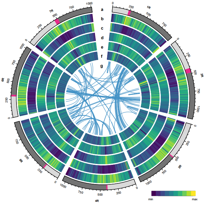 在威寧黑麥基因組與普通小麥3個(gè)亞基因組的比較中,1R、2R和3R分別與小麥1、2和3組染色體完全共線。在4R中發(fā)現(xiàn)與4A/4B/4D、7A/7B/7D或6A/6B/6D部分共線性的三個(gè)區(qū)域。5R與5A完全共線,與5B、5D部分共線是由于易位的4B或4D片段在5BL或5DL的長(zhǎng)臂融合(圖3c)。在6R中,觀察到3個(gè)區(qū)域與6A/6B/6D、3A/3B/3D或7A/7B/7D部分共線。這些數(shù)據(jù)將有助于黑麥在禾本科比較基因組學(xué)研究以及黑麥與普通小麥雜交研究中的應(yīng)用。